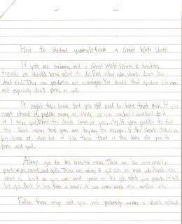 This is my girlfriend's first year as a teacher. She currently has a third grade classroom, needless to say, 3rd graders are pretty funny. This is Tommy's essay and illustration entitled "How to Defend Yourself from a Great White Shark."